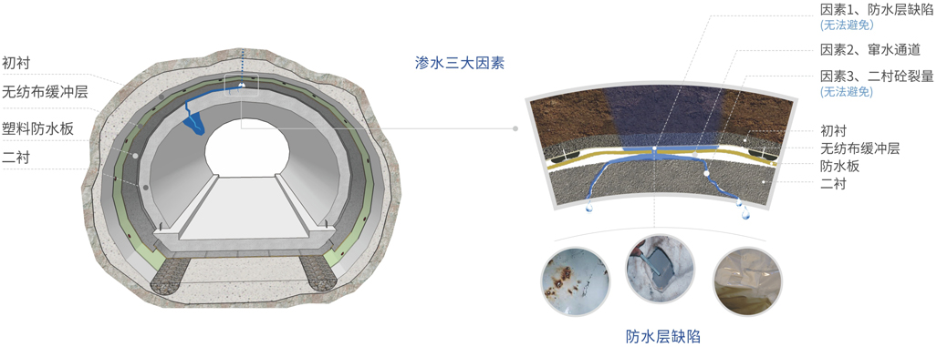 傳統(tǒng)的礦山法隧道基本上以塑料板(EVA、PVC、ECB等)為主體材料進(jìn)行防水設(shè)防,在國(guó)內(nèi)現(xiàn)有的施工條件和組織形式下,滲漏很普遍,嚴(yán)重影響行車安全和結(jié)構(gòu)壽命,給后期維護(hù)帶來沉重的負(fù)擔(dān)。