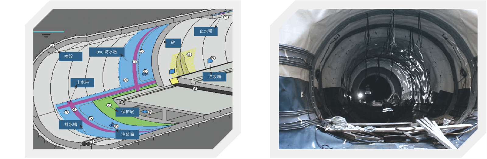 凱倫暗挖隧道系統(tǒng)解決方案,以“融合防水”為理念,采用以MBP-P為代表的高分子自粘膠膜預(yù)鋪防水卷材,能有效地與后續(xù)澆筑的混凝土結(jié)構(gòu)融為一體,避免水在兩者之間竄流。近幾年,該卷材也開始運(yùn)用于隧道項(xiàng)目,并被多個(gè)鐵路建設(shè)部門所關(guān)注。