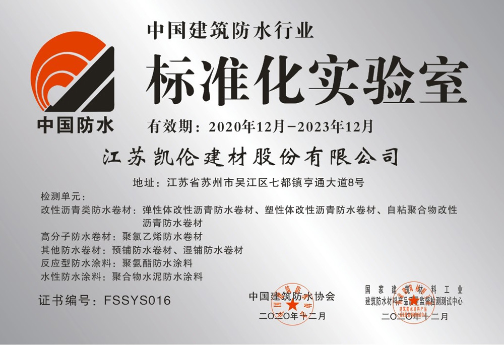 建筑防水行業(yè)標(biāo)準(zhǔn)化實(shí)驗(yàn)室,由中國(guó)建筑防水協(xié)會(huì)和國(guó)家建筑材料工業(yè)建筑防水材料產(chǎn)品質(zhì)量監(jiān)督檢驗(yàn)檢測(cè)中心聯(lián)合評(píng)定,通過(guò)對(duì)實(shí)驗(yàn)室人員資質(zhì)、檢驗(yàn)設(shè)備、檢驗(yàn)方法、產(chǎn)品對(duì)比試驗(yàn)等項(xiàng)目的綜合考評(píng),各項(xiàng)分值達(dá)標(biāo)后方可通過(guò)。標(biāo)準(zhǔn)化實(shí)驗(yàn)室,是對(duì)企業(yè)生產(chǎn)研發(fā)水平的肯定。